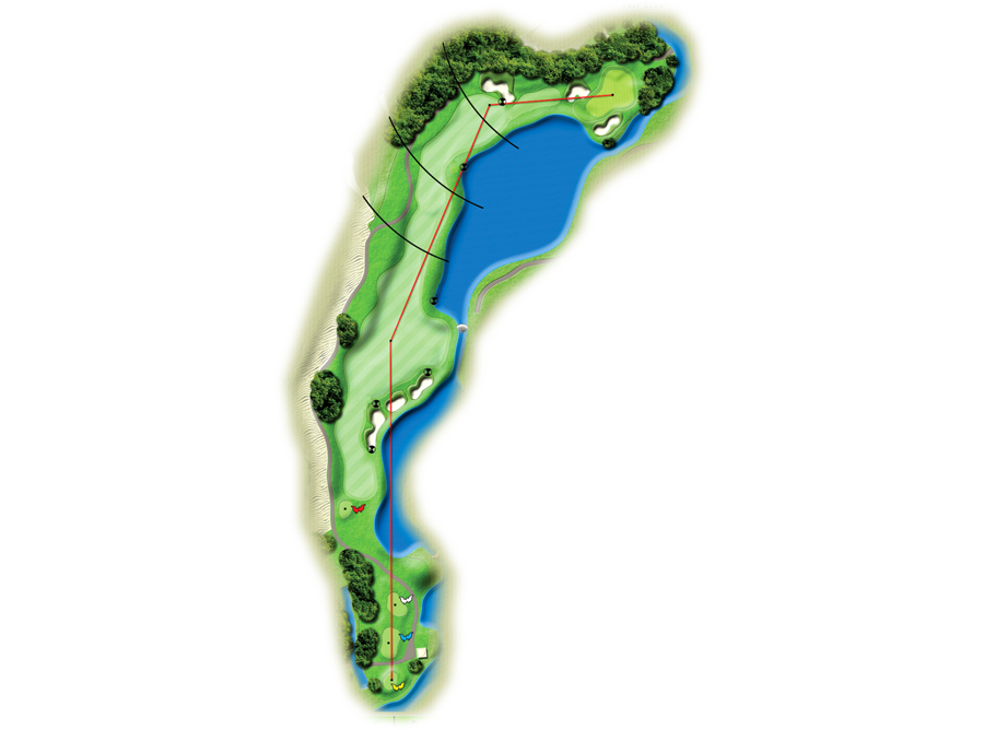 This par five sets out the challenge for the long hitter to position his drive to point where the green can be reached with the second shot, but even the layup to reach the green in three shots is fraught with peril.